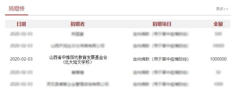 2020年2月3日,山西省中維陽光教育發展基金會攜北大培文學校共同捐資人民幣100萬元,用于疫情防控工作。