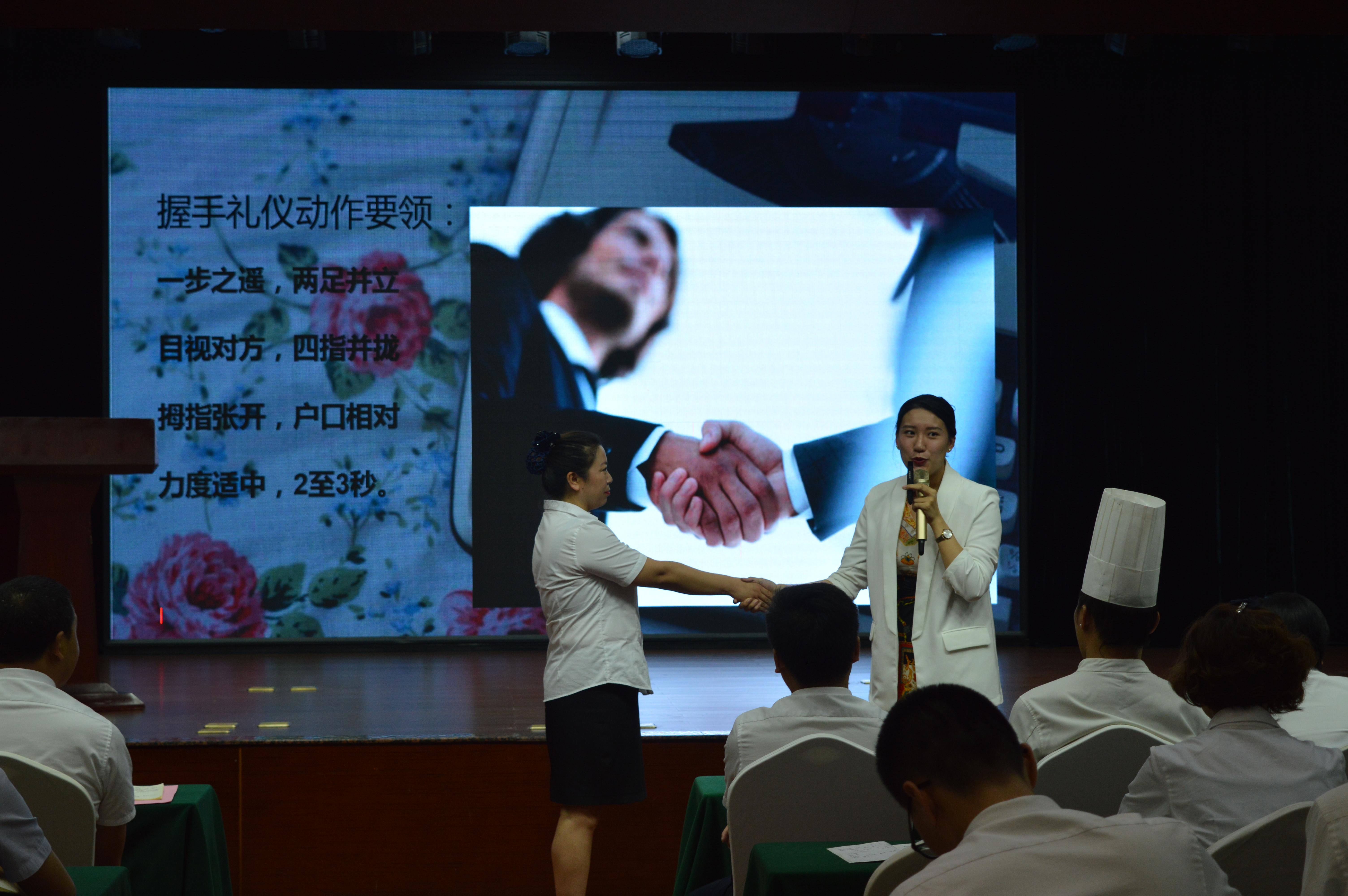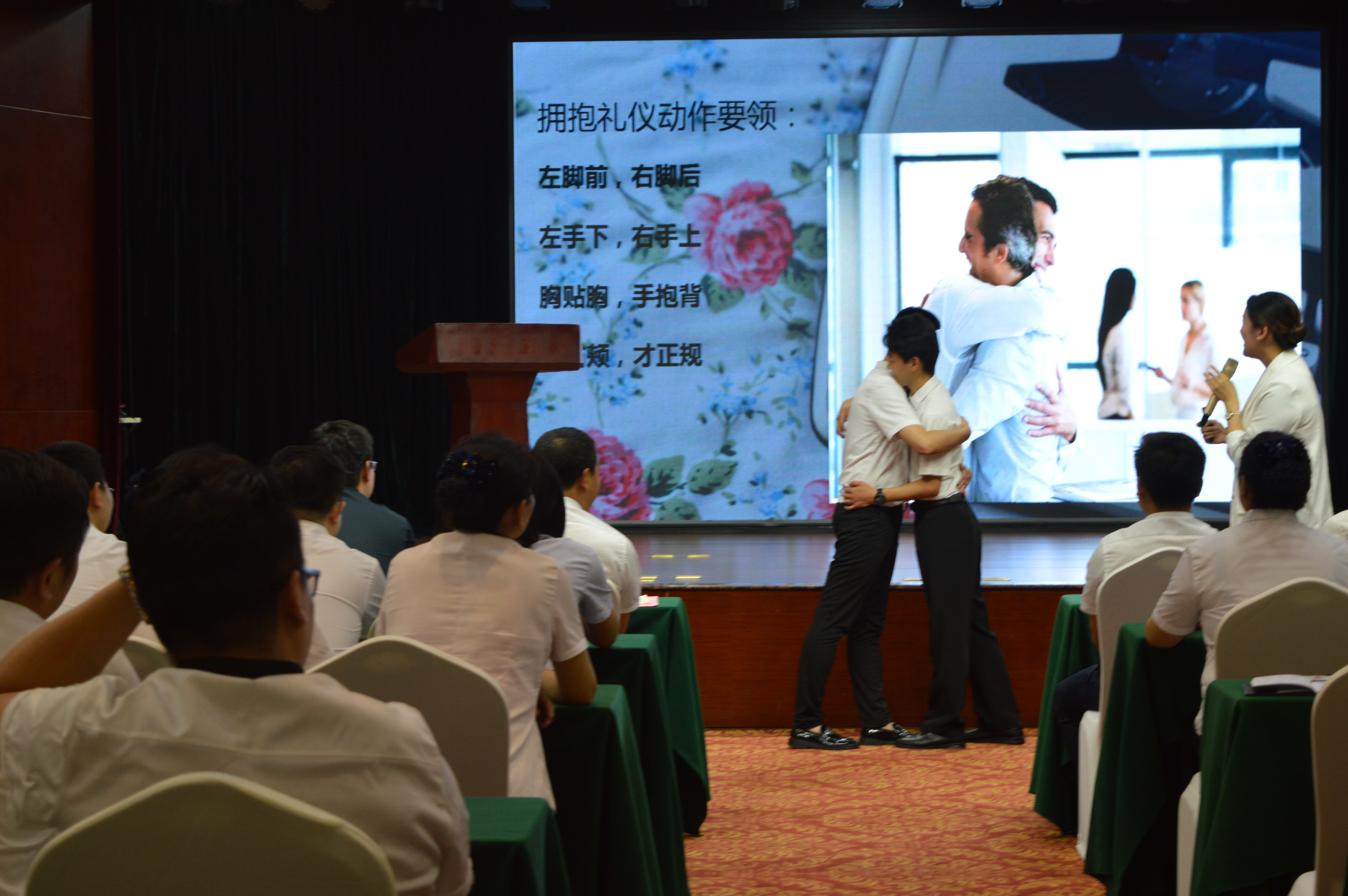 嘉賓曹老師為大家進行了精彩而生動的服務禮儀培訓,曹老師從日常的儀表、站姿、坐姿、行走、擁抱、握手、鞠躬等禮儀規范方面,邀請現場員工互動參與并示范講解,另外通過案例與影片分享,闡釋了服務美學的重要意義,以及如何從基本的服務到滿意的服務再到感動的服務。現場教學氛圍活躍,精彩處引發陣陣掌聲。