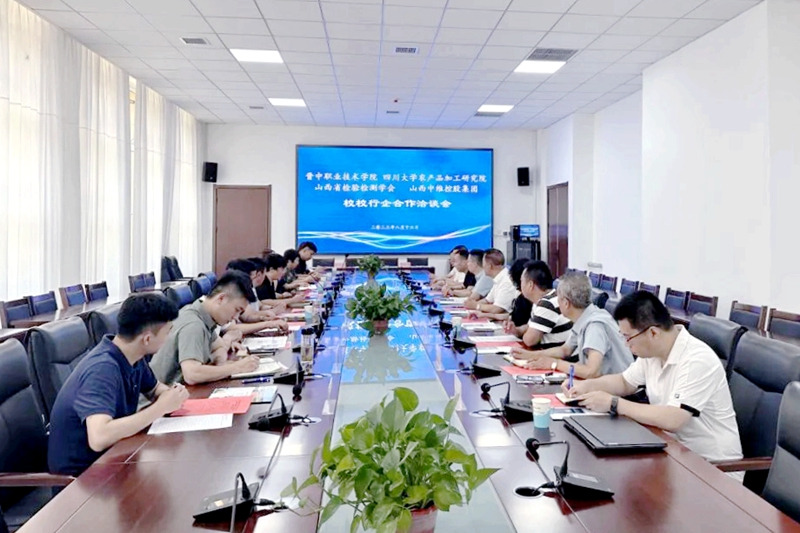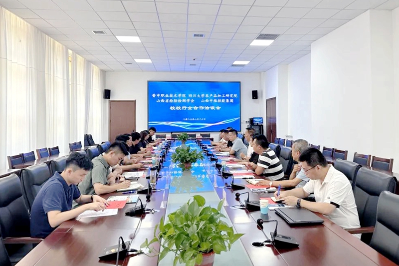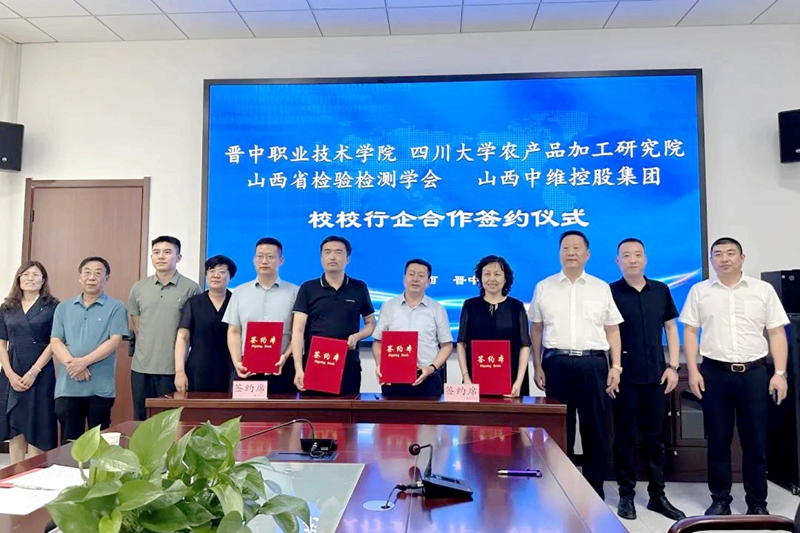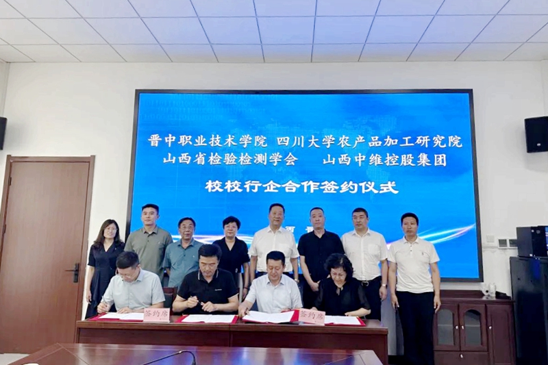 2023年8月18日,晉中職業技術學院、四川大學農產品加工研究院、山西省檢驗檢測學會、中維控股集團“校校行企”合作洽談會議暨共建“食品產業學院”合作簽約儀式在晉中職業技術學院行政樓舉行。晉中職業技術學院院長雒衛廷、四川大學農產品加工研究院常務副院長趙志峰、山西省檢驗檢測學會副會長張紅、中維控股集團董事長郭秀忠等領導出席,與會的還有各單位相關負責同志。